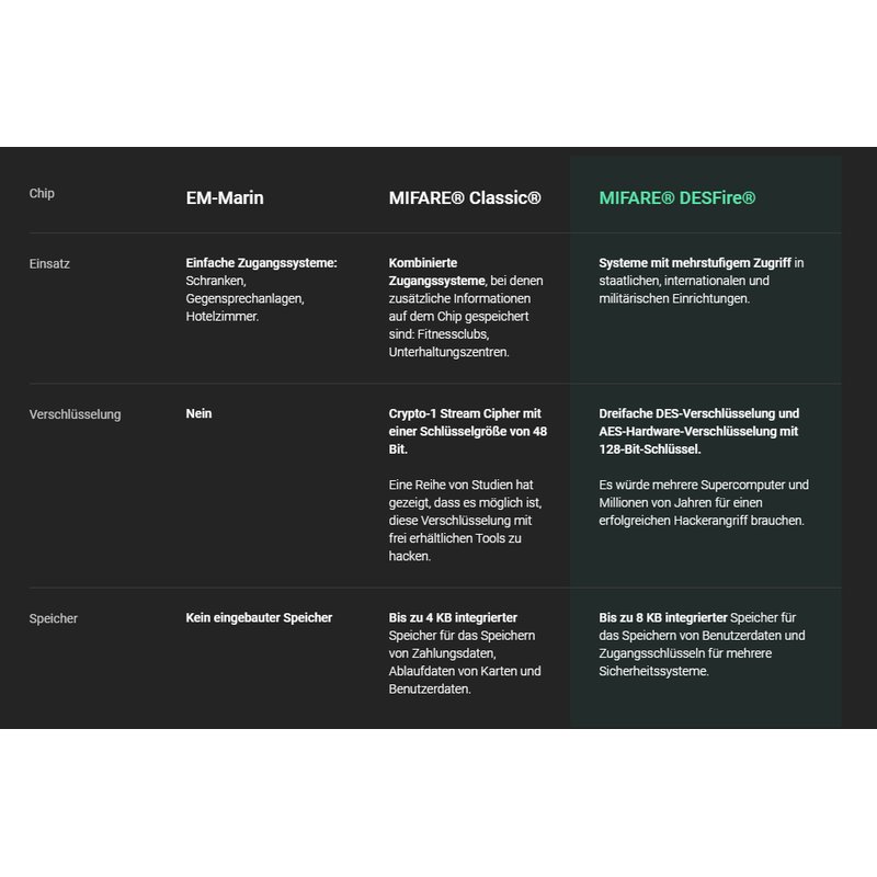 Für Anwender funktioniert der kontaktlose Zugang intuitiv. Für die Unscharfschaltung des Systems müssen Sie lediglich eine Karte oder Schlüsselanhänger an Keypad halten. Doch hinter dieser anwenderfreundlichen Bedienung steckt eine beeindruckende Technologie. Die Karten der Pass-Reihe und Schlüsselanhänger Tag sind mit DESFire® Chips ausgestattet. Wir haben sie mit den Chips verglichen, die in den meisten Zugangssystemen auf der ganzen Welt verwendet werden.
