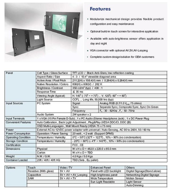 Panel Cell Type / Glass Surface TFT LCD / Black Anti-Glare, low reflection coating